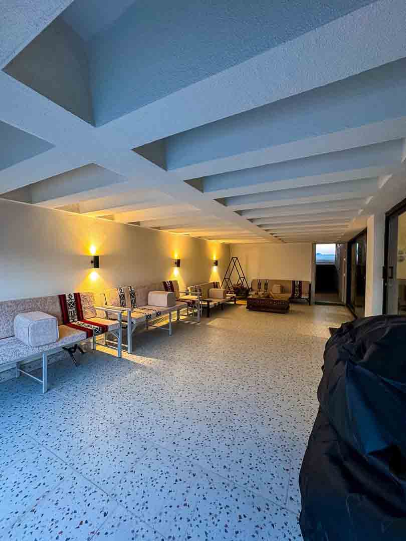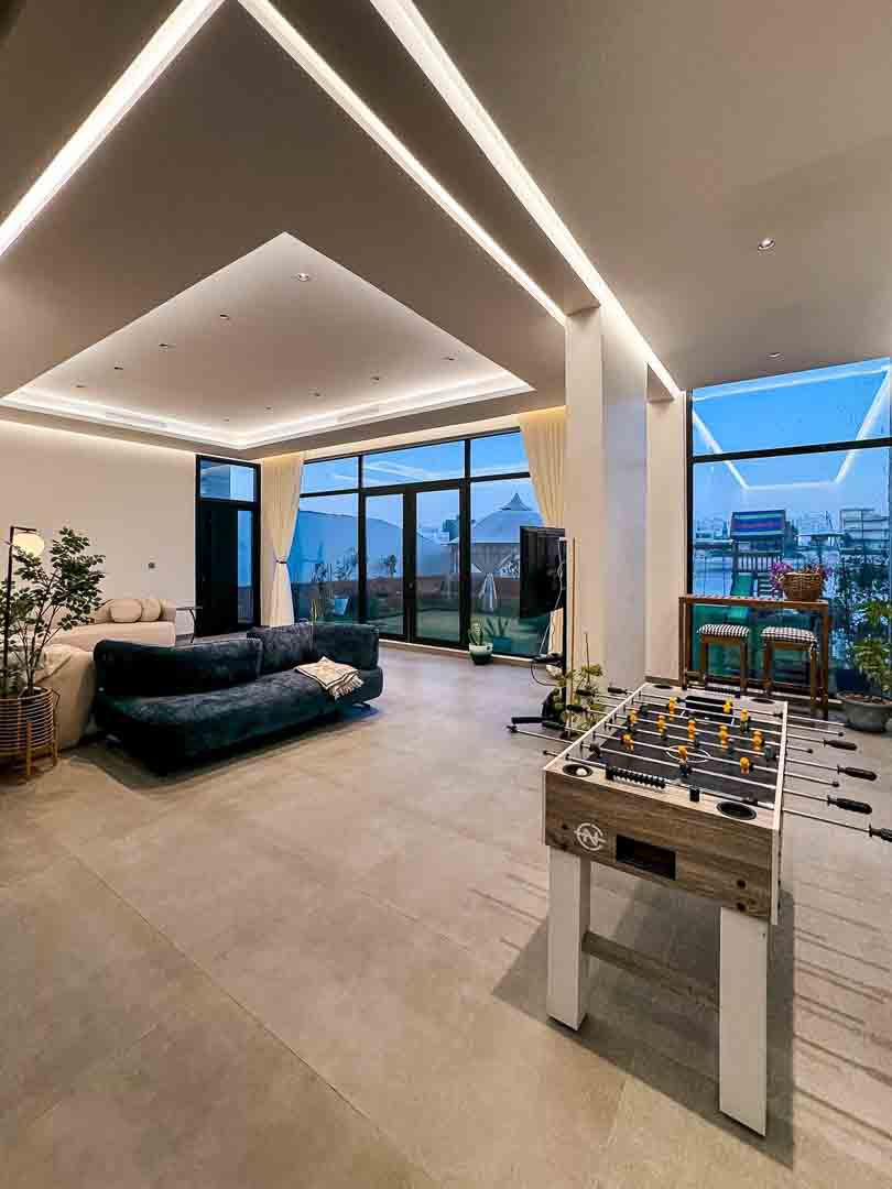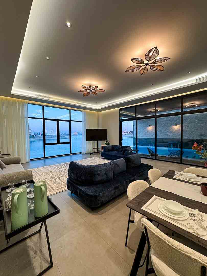 - صالة كبيرة مطلة على المسبح والبحر