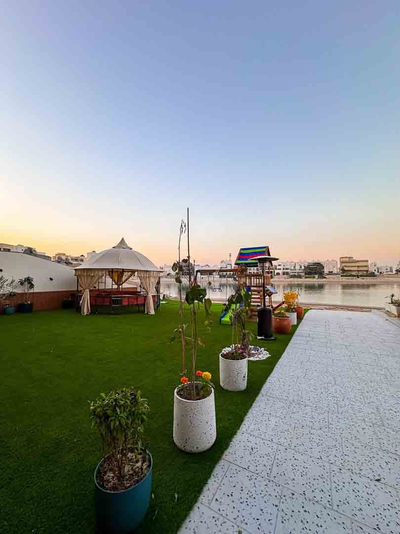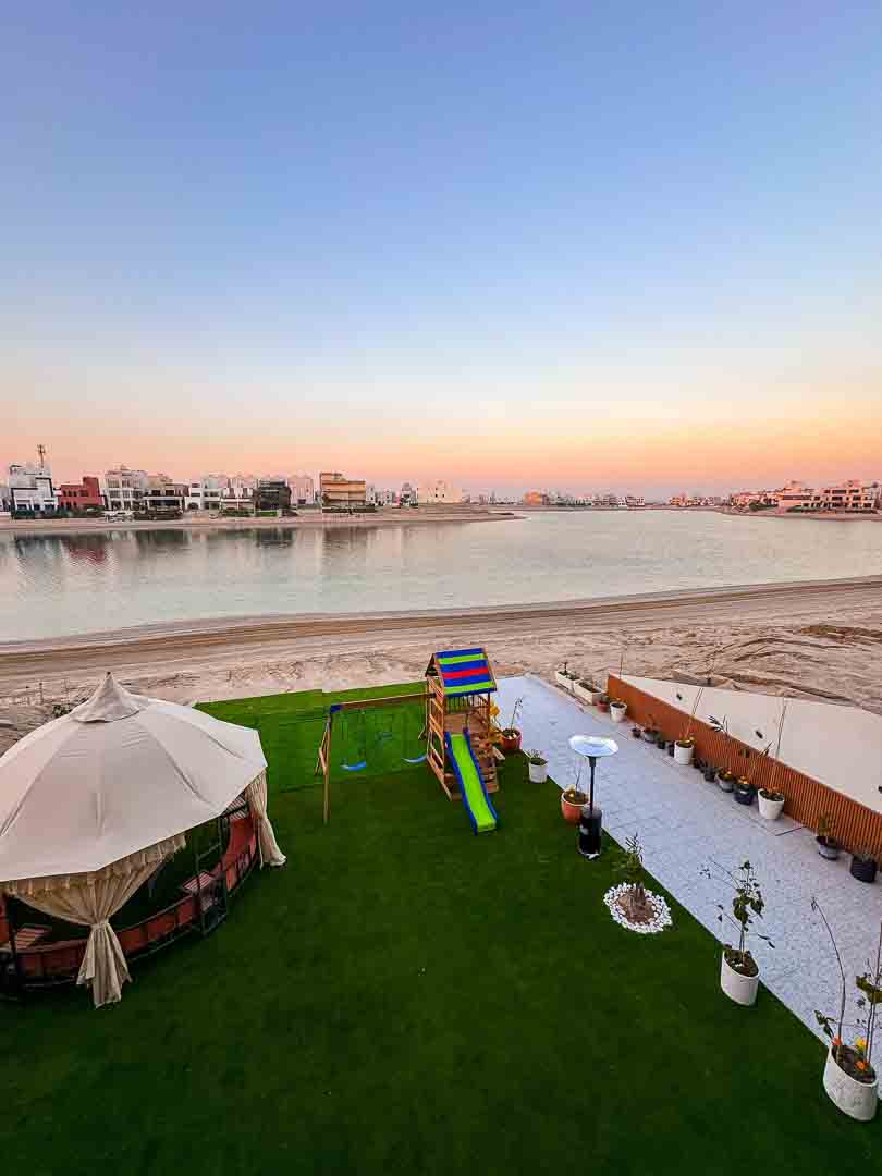 -حديقه كبيره عالبحر مع جلسات تكفي ١٢ شخص وكراسي اضافية