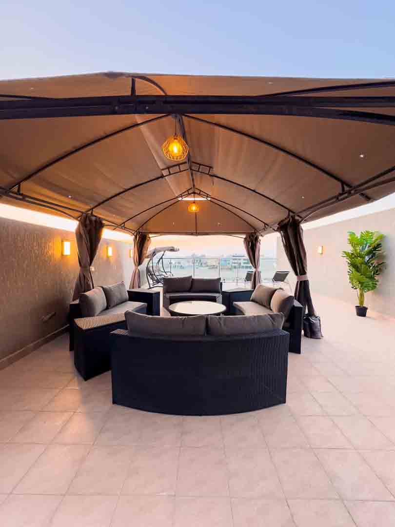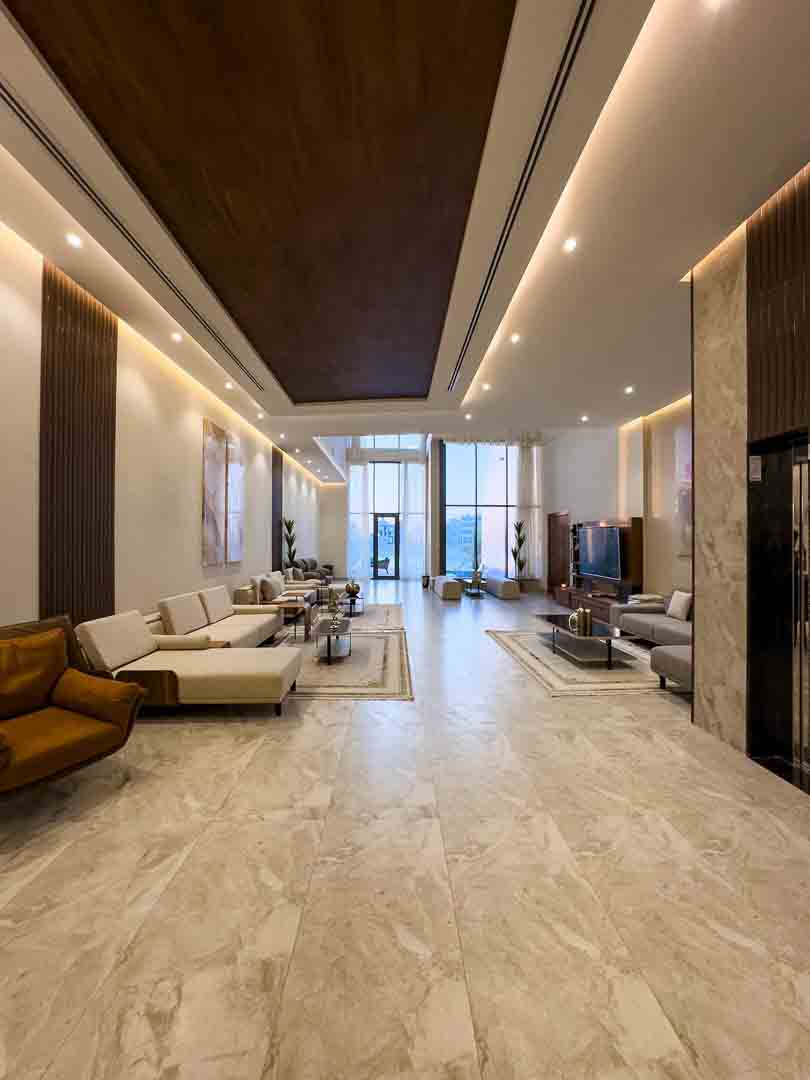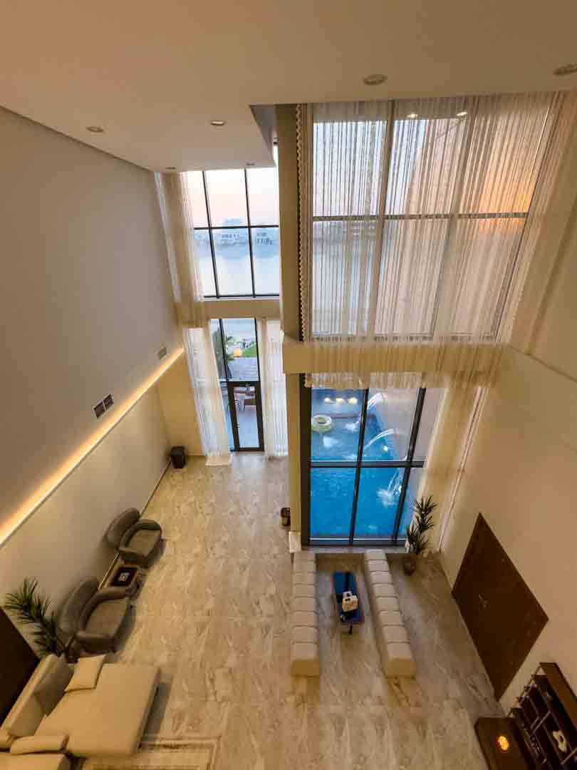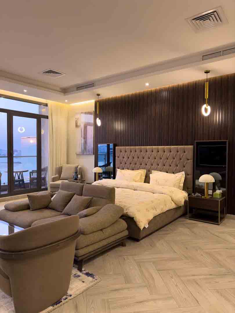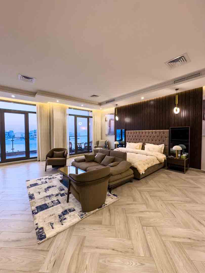 - الجناح الرئيسي vvip + حمام فندقي مجهز بجاكوزي و تلفزيون + بلكونه مطله على الخور
