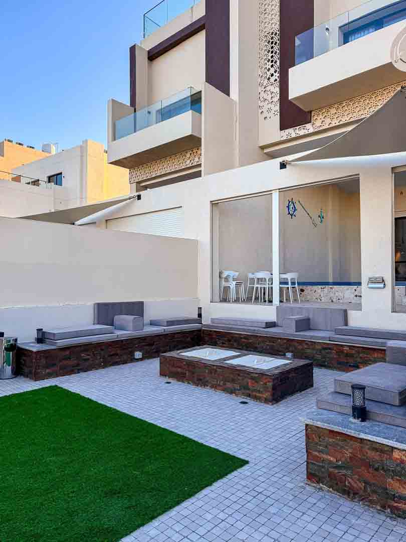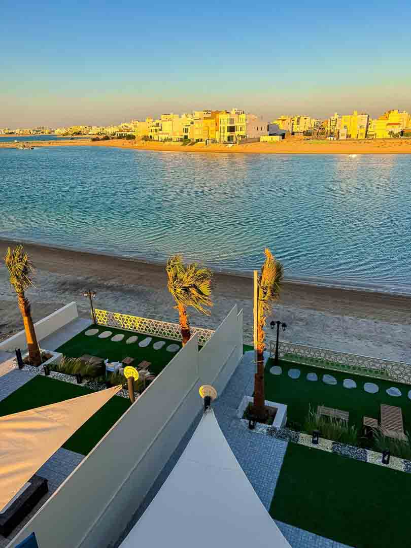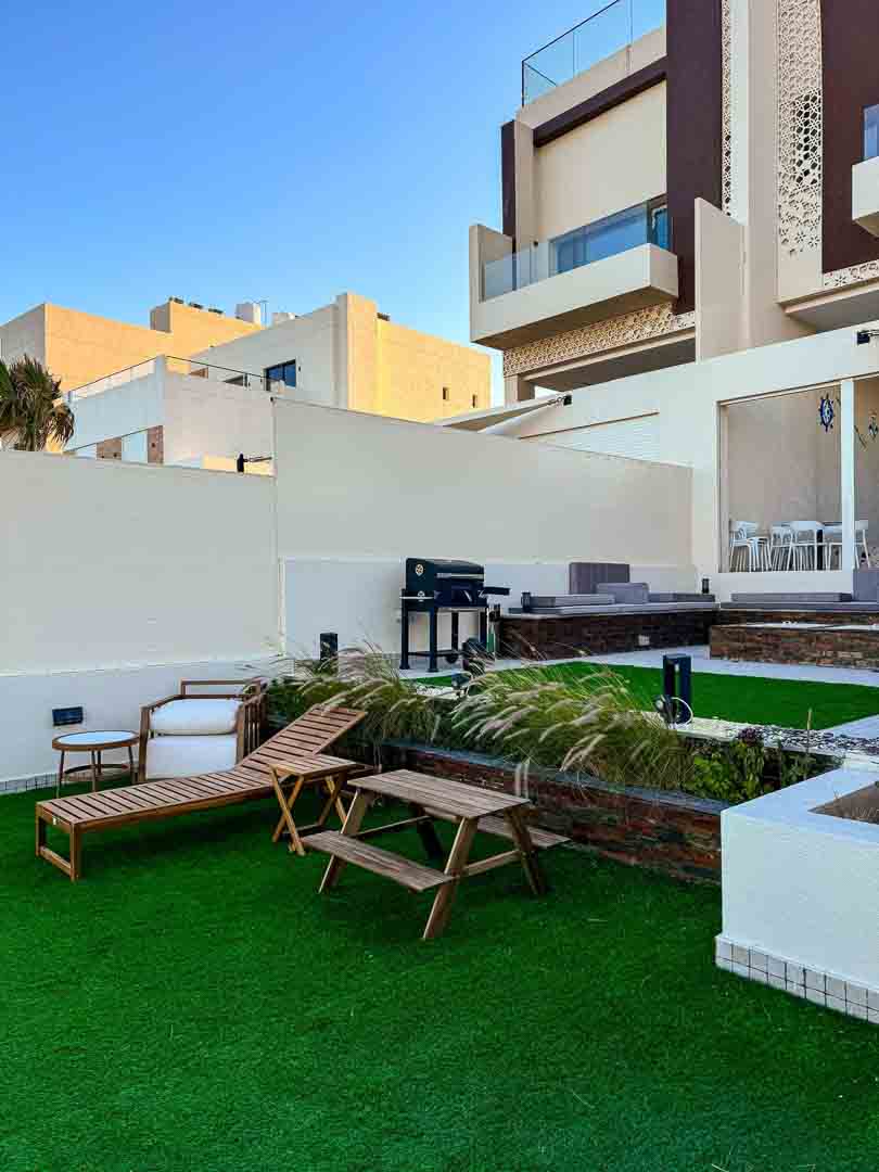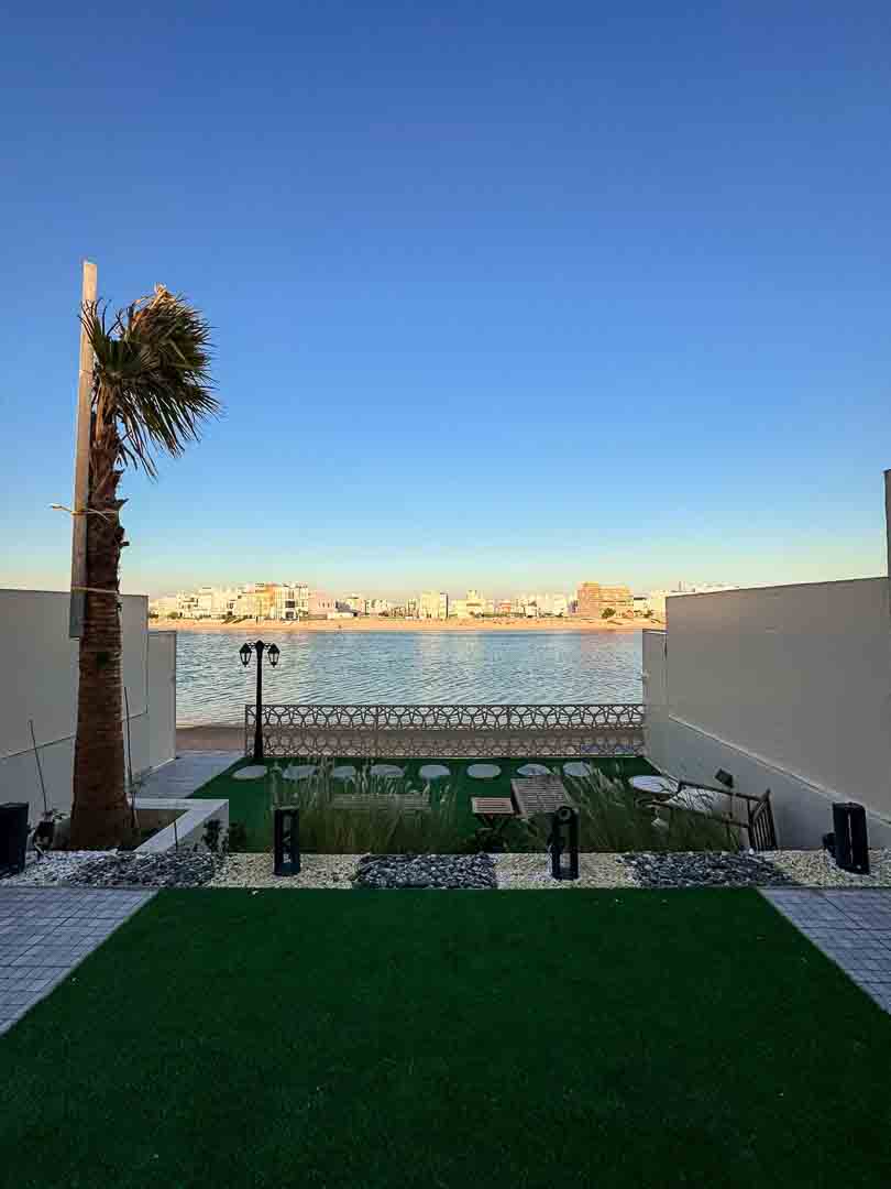 -حديقه كبيره عالبحر مع جلسات تكفي ٢٥ شخص وكراسي اضافية + سرير تان
