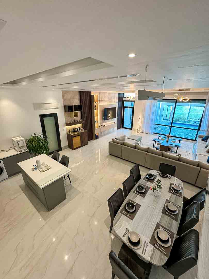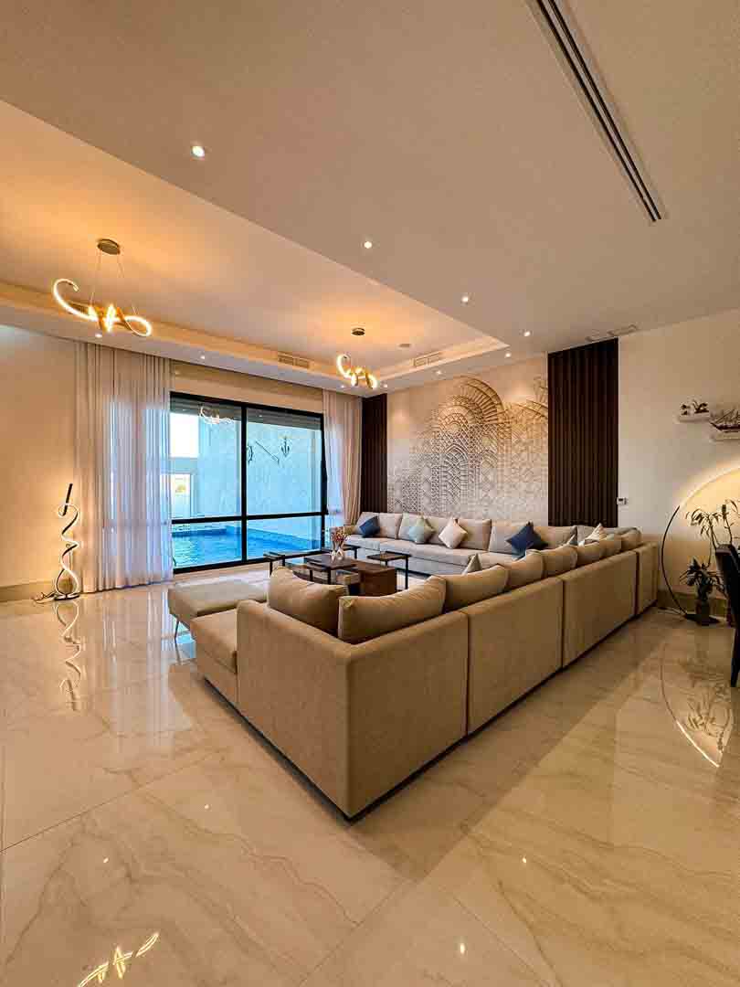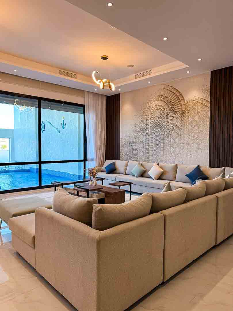 - صالة كبيرة مطلة على المسبح والبحر