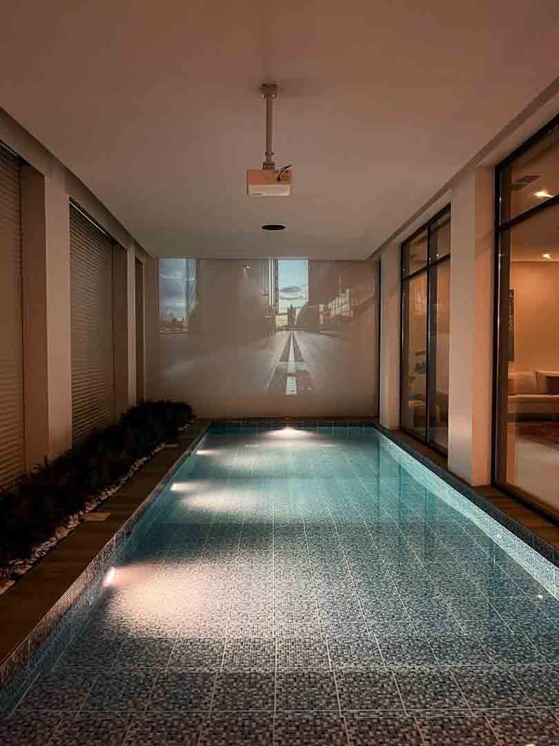 و شاشه سينما مع سماعاتها بحمام السباحه